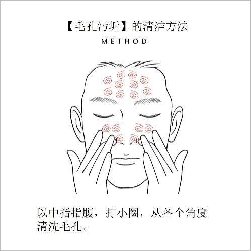 在洁面过程中,在毛孔污垢明显部位,以中指指腹画小圈的手势,从不同角度进行“打圈清洁”,可以更彻底清除毛孔污垢。如有需要,适当配合使用皮肤磨砂或洁面泥等单品,效果更佳。洁面后,可使用清爽型化妆水和轻薄型乳液进行保湿,确保水润感。