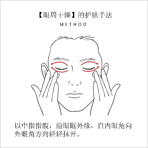在全脸保湿基础上,针对眼周易干燥部分,加强保湿力度。使用中指指腹贴合眼睑弧度,在不施加力度的情况下,从眼头向眼尾单方向轻轻涂抹。保持手指自然贴合、避免翘起,有助于防止涂抹不均。此外,也建议积极使用眼霜进行有针对的护肤。