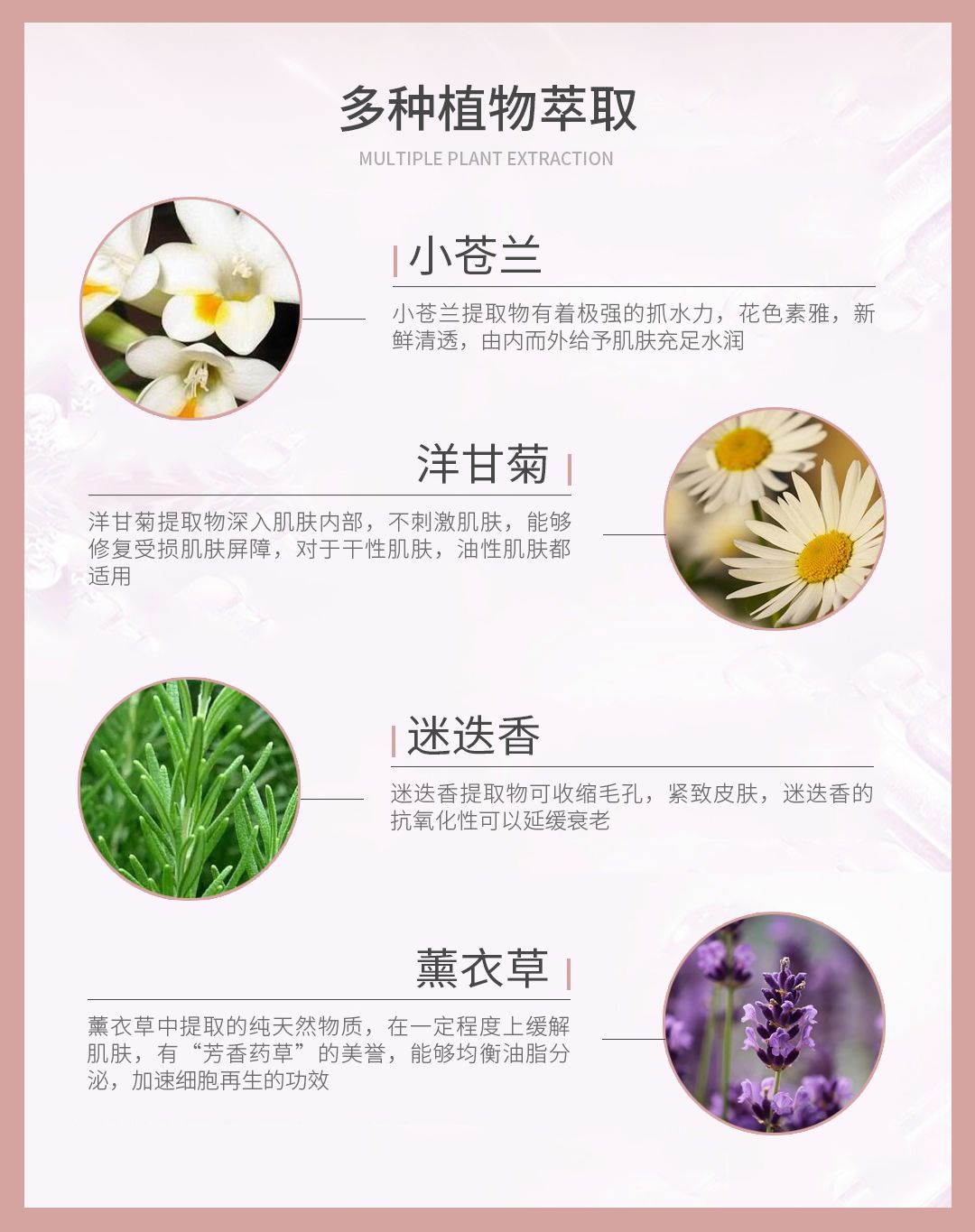 提取物小苍兰、洋甘菊、迷迭香、薰衣草等,分子很小,可以快速进入皮肤的肌底层,彻底击破熬夜、辐射暗沉肌,加速老废角质脱落,令肌肤焕然新生。